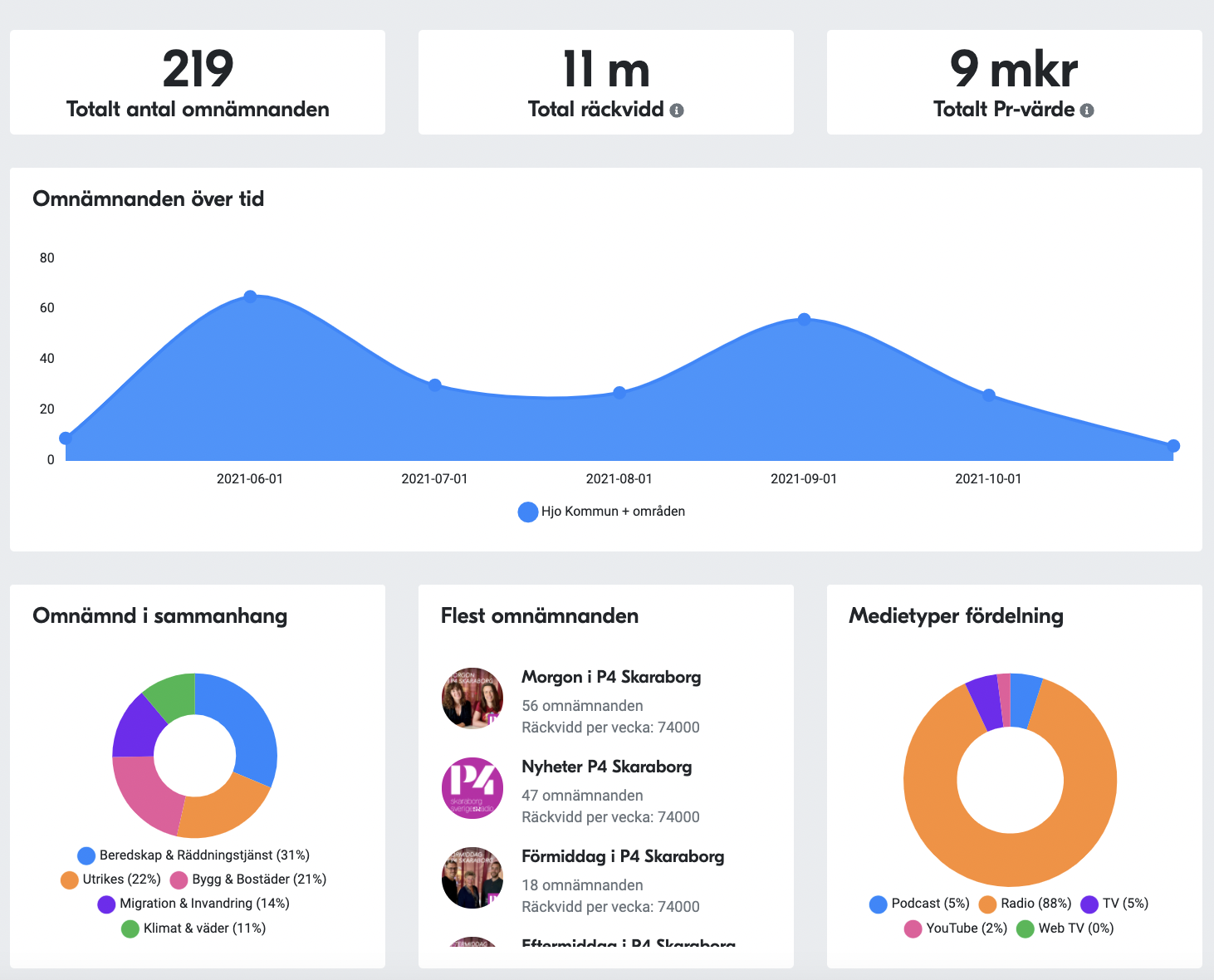 I rapporten nedan ser vi ett exempel på hur kommunens publicitet sett ut under de senaste 6 månaderna. Statistiken visar att Hjo omnämnts ofta och i många olika typer av mediesammanhang, något som tyder på att kommunen arbetar konsekvent och strategiskt med sin kommunikation.