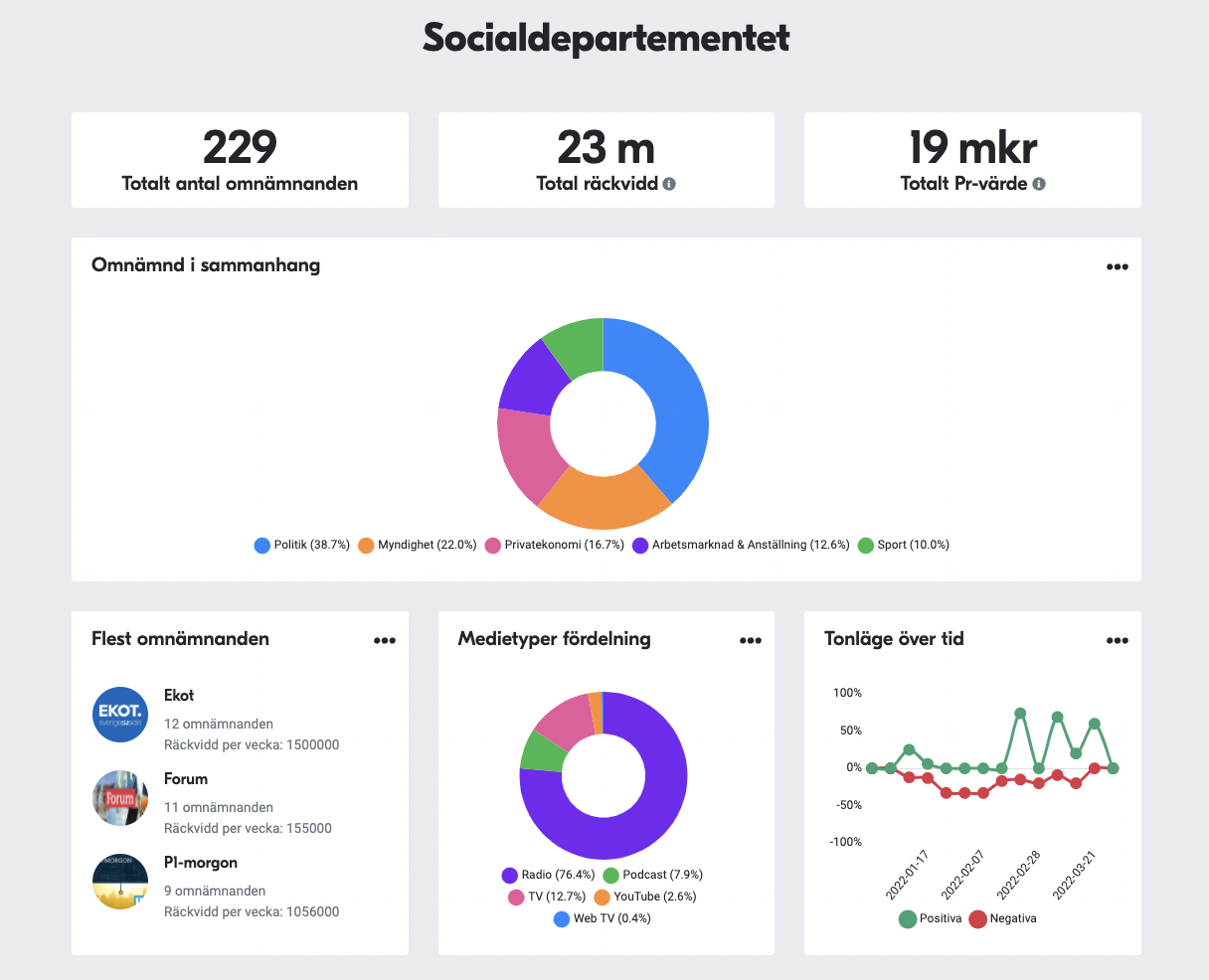 Enligt All Ears mätning har Socialdepartementet omnämnts 229 gånger i talade medier under våren — en publicitet som resulterat i ett PR-värde på19 miljoner kronor. All Ears analys visar även att medienärvaron ökat med nästan 40 % sedan samma period förra året.